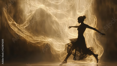 A side view of a dancer mid-motion, the glowing golden light trailing from their movements