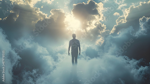man, cloud, light, walking, surreal, aethereal, heavenly, dreamlike, atmospheric, spiritual, journey, calm, peaceful, serene, motivational, inspirational, sunlight, silhouette, fantasy, divine, mysterious, hope, calmness, solitude, adventure, path, meditative, nirvana, ascension, dramatic sky, creative
