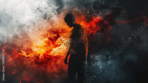 silhouette, person, explosion, fiery, smoky, dynamic, dissolving, transformation, dramatic, intensity, abstract art, fire, smoke, dark background, concept, mystery, energy, creative, artistic, power, digital artwork, flames, shadow, burning, emotional, surreal, destruction, heat