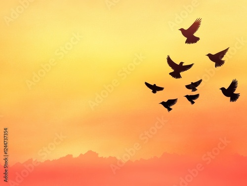 A silhouette of birds flying against a colorful sunset backdrop, capturing the beauty of nature and freedom.