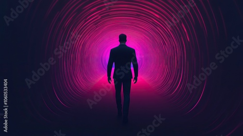 A silhouette walks towards a vibrant, glowing tunnel of pink and purple, symbolizing exploration and the journey into the unknown.