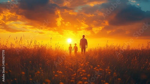 A silhouetted family ? two adults and a child ? enjoys a peaceful walk through a field during a beautiful sunset. The sun is partially obscured by clouds, creating a dramatic and serene atmosphere.