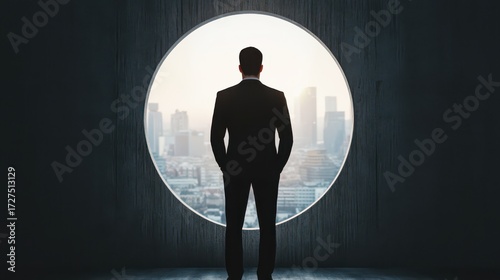 A silhouetted figure in a suit gazes out a circular window at a city skyline, suggesting contemplation and ambition.
