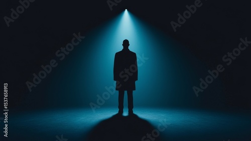 silhouette, person, man, figure, spotlight, light, stage, shadow, illumination, performance, blue, dark, dramatic, mysterious, standing, full-length, backview, isolated, single, anonymous, theatre, concept, identity, exposure, fear, anxiety, vulnerability, entertainment, show, business, drama, abstract, studio shot, copy space, visual, graphic
