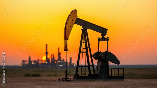 A silhouetted oil pump against a vibrant sunset, highlighting the industrial landscape and the extraction of natural resources.