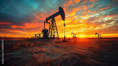 oil, pump, jack, rig, sunset, sky, cloud, field, horizon, silhouette, energy, industry, production, extraction, natural resource, power, fuel, environment, technology, machinery, equipment, metal, metalwork, landscape, rural, farm, agriculture, golden hour, twilight, dusk, dawn, sunrise, daybreak, red, orange, yellow, blue, purple, brown, green, black, grey, dark, light, contrast, texture, pattern, shape, form