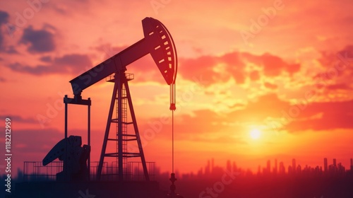 A silhouetted oil pumpjack against a vibrant sunset, highlighting energy extraction in a dramatic sky.