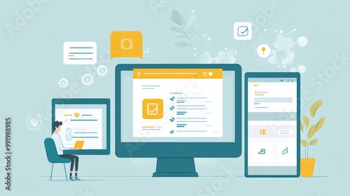 A simple illustration showing a user creating an account. It includes icons for creating an account, a registration form, and sections for login and password.