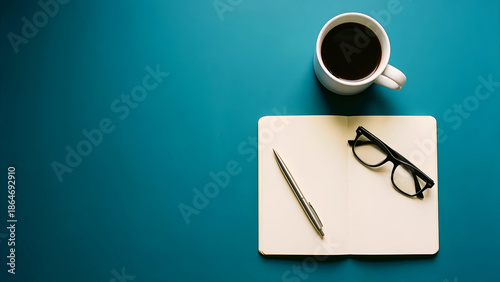 A simple overhead view captures essential work items including a cup of coffee, open notebook, reading glasses, and a sleek metal pen ready for planning.