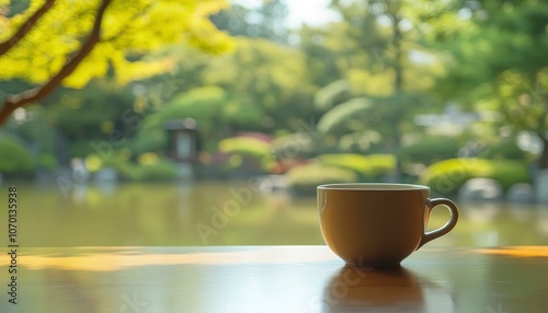 coffee mug, wooden table, duck pond, blurred background, peaceful, tranquil, relaxing, nature, morning, afternoon, sunlight, shadow, copy space