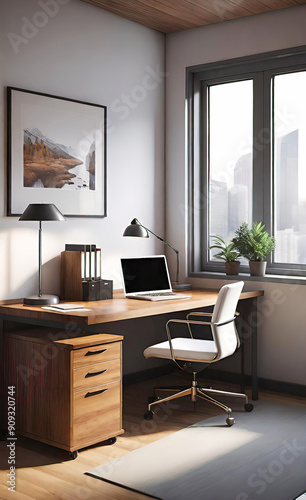a simple wooden office desk in a small white office, a pleasant cozy atmosphere for comfortable work
