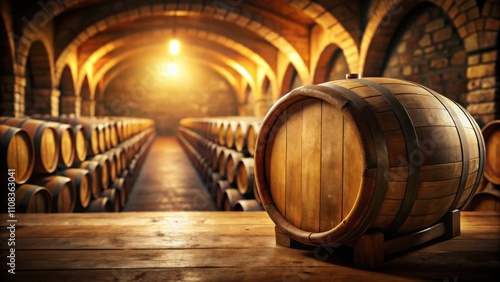 A single barrel of aged wine rests on a wooden table in a dimly lit cellar filled with rows of barrels, each holding a promise of flavor and history.