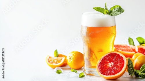 A single beer glass filled with a refreshing fruit-infused beer, garnished with slices of citrus and mint, beautifully presented against a bright white background.