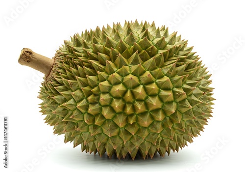 durian, fruit, spike, shell, tropical, food, asian, ripe, sweet, exotic, delicious, isolated, closeup, green, white, background, texture, healthy, fresh, nature, macro, single, stem, whole