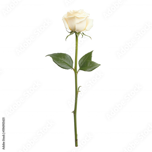 A single elegant white rose with green leaves on a slender stem., isolated on a transparent background.