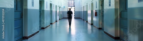 single, figure, walk, long, sterile, hallway, loneliness, paseo, character, grim, haunt, isolate, barren, robotic, corridor, passage, ominous, lonely, shadow, silent, hollow, alone, restrict, oblique, cold, impose, desolate, solitude, forbid, solemn, lanky, remote, reclusive, exhaust, crypt, warehouse, scarey, ghostly