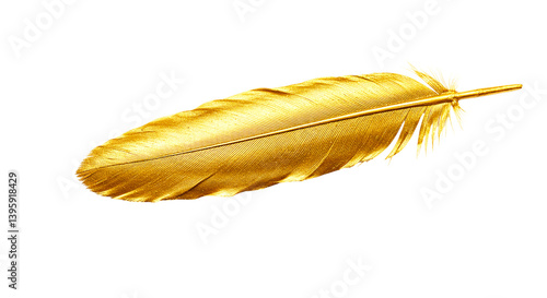 A single golden feather isolated on a black background with detailed texture and light reflecting
