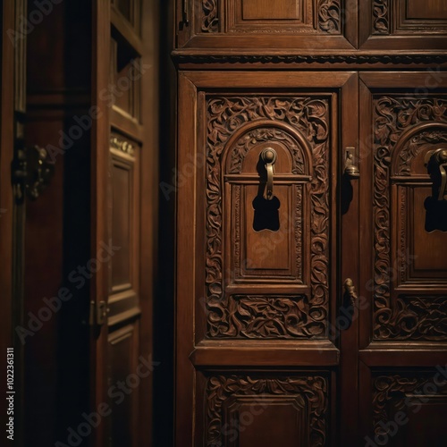 A single large, antique wooden locker with ornate carvings and an old-fashioned keyhole, placed in a museum-like setting.