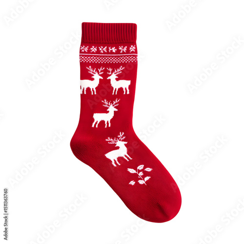 sock, red, christmas, reindeer, snowflake, pattern, holiday, winter, festive, decoration, apparel, clothing, textile, fabric, design, ornament, seasonal, celebration, merry, joyful, warm, cosy, traditional, cute, gift, present, stocking, cervid, antler, white, illustration, graphic, isolated, closeup, single, background, wool, cotton, knitted, christmas, eve, december, celebrate, stylish, with