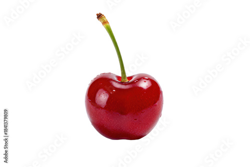 A single ripe red cherry with a green stem on a white background