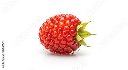A single ripe red raspberry with green leaves on a white background, showcasing its vibrant color and texture.