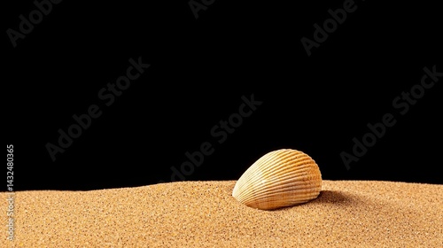 A single seashell rests on a smooth sand surface against a dark background, highlighting its texture and natural beauty.