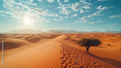 A single tree stands tall in a vast desert landscape, with sand dunes stretching out under a bright blue sky and the sun shining.