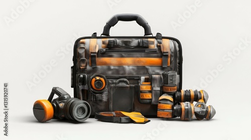 A single, ultra-detailed industrial safety kit, on a pure white background, highlighting its essential protective gear with professional studio lighting