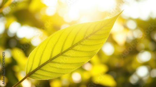 A Single, Vibrant Leaf Illuminated by the Warm Glow of Sunlight, Backlit by a Defocused Green Background