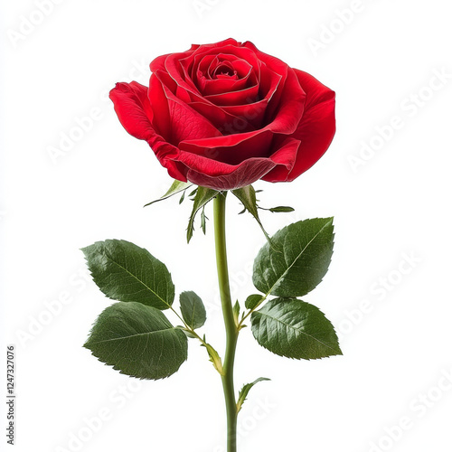 A single, vibrant red rose stands tall, its velvety petals unfurling against a stark white background, accented by lush green leaves.