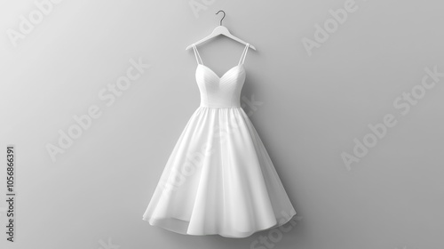 A single white dress hangs from a hanger in a clean and simple setting