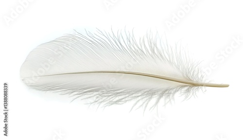 A single white feather floating in mid-air against a pure white background, soft lighting accentuating delicate curves and wispy texture, minimalist elegance.