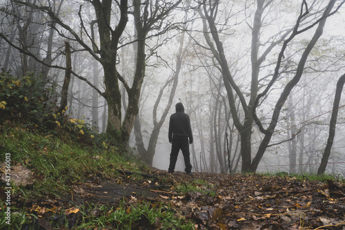 A sinister hooded figure, back to camera, on a path through a moody misty winter woodland