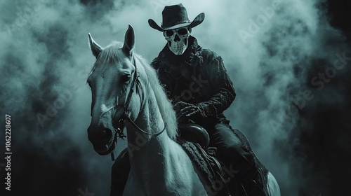 cowboy, skull, horse, fog, smoke, ghost, skittish, mysterious, horror, halloween, death, western, ride, dark, shadow, night, fantasy, mythology, creepy, fear, scarey, spirit, monster, haunted, undead, evil, mythical, creature, legend, supernatural, paranormal