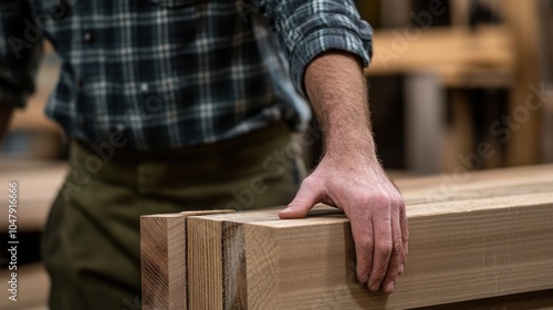 A skilled craftsman carefully inspects and positions wooden planks in a workshop filled with natural light, showcasing intricate woodworking techniques and craftsmanship