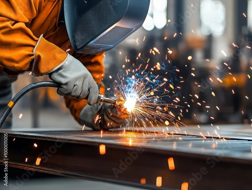 A skilled welder in protective gear creates sparks while working on metal in an industrial environment.