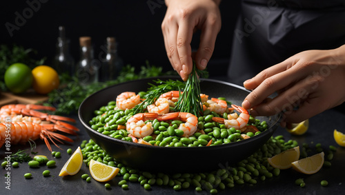 A skillet of cooked peas and shrimp with a hand reaching in to grab a shrimp. There is a lemon and other ingredients scattered around the skillet.