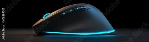 A sleek, black gaming mouse with blue LED accents glowing along its base and buttons, resting on a dark surface, clean mouse