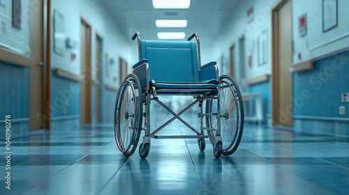 A sleek blue wheelchair sits in the middle of a hospital hallway, well-lit with modern surroundings, representing mobility and accessibility