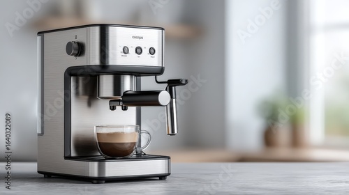 A sleek espresso machine with a cup of coffee, set against a modern kitchen backdrop, highlighting a contemporary design.