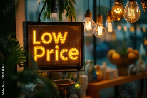 A sleek, minimalistic light box with the words "Low Price" glowing brightly, surrounded by stylish decorations like plants, lamps, and modern furniture inside a trendy store.