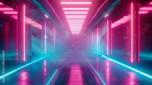 A sleek, neon-lit hallway with vibrant pink and blue lights emanating from the floor and walls, enveloped in a misty ambiance, perfect for exploring themes of technology and cyberpunk.