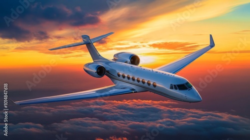 A sleek private jet soaring through a colorful sunset sky, showcasing luxury travel and modern aviation technology.