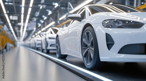 A sleek row of white cars in a modern factory setting, showcasing an advanced automotive production line.
