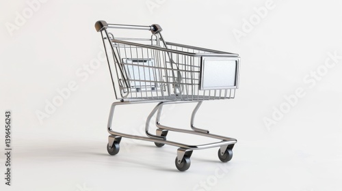 A sleek, silver shopping cart stands isolated on a clean white background, highlighting its metallic structure and functional design