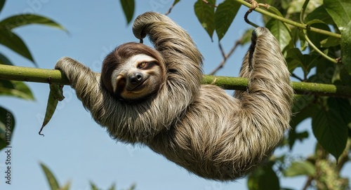 A sleepy sloth hanging upsidedown on a vine with a relaxed expression