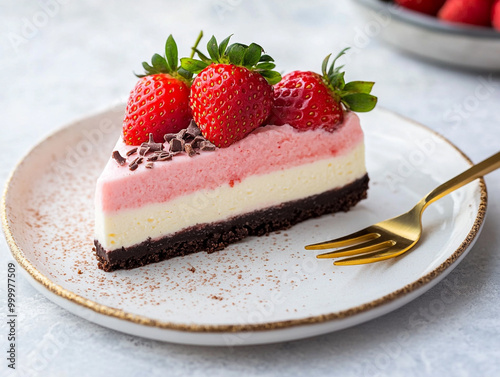 A slice of strawberry cheesecake on a white plate, with fresh strawberries and a clean background.