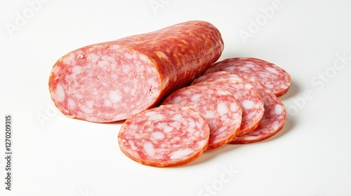no people, photo, color image, meat, food, cut-out, horizontal, closeup, food and drink, freshness, ham, ingredient, snack, deli, pork meat, sausage, white background, healthy eating, spice, beef, meal, red, breakfast, cooked, cooking, white color, 2025, choice, indoor, japan, lifestyle, merchandise, package, quality, recycling, textured, tradition, transparent, vitality, italian food, lunch, plastic, plate, romania, salami, sandwich, thin