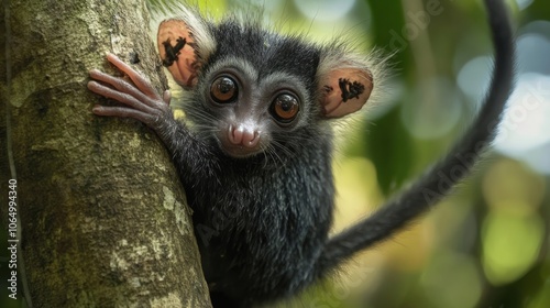 A small, black and white lemur with large eyes and a long tail climbs a tree trunk.