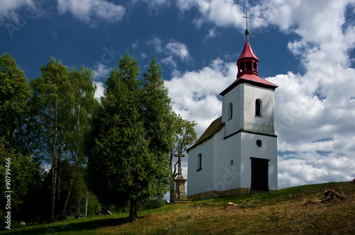 A small Catholic church standing in the landscape.